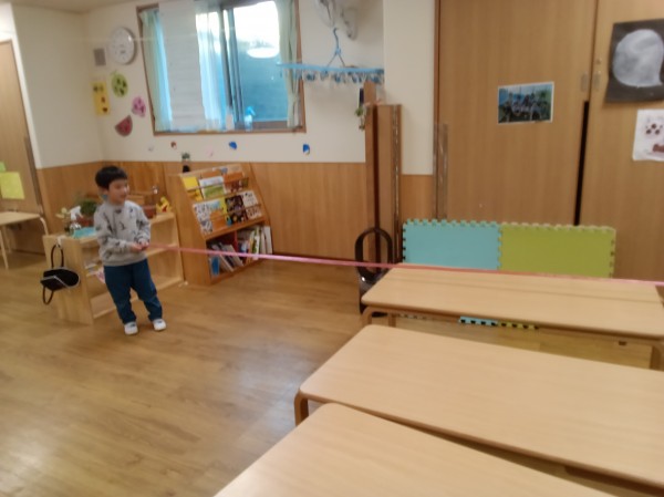 咳とくしゃみのつば(飛沫)の飛散距離の教材は、保健教育が終わってからもとても人気で、順番待ちをして実際にやってみていました。飛沫が〇〇m飛ぶから、ちゃんと咳エチケットやってねと子どもたちに伝えることが難しいので、体感してもらうのが目的です。最後には遊びになってしまいましたが、少しでも子どもたちの印象に残ってくれればいいですね。