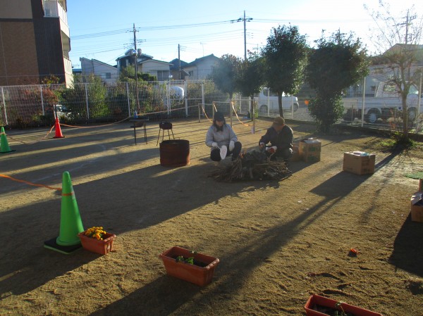 お手伝いをしてくださるお父さんやお祖父ちゃんも朝早くから来てくださり、火を起こしお芋を焼き始めます。