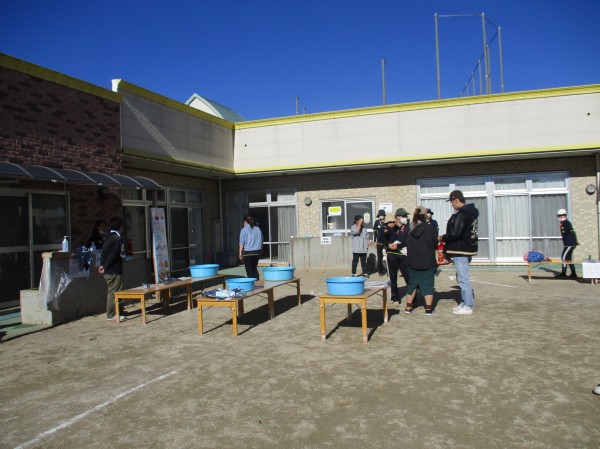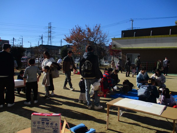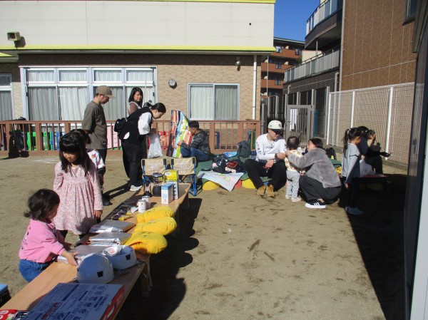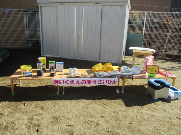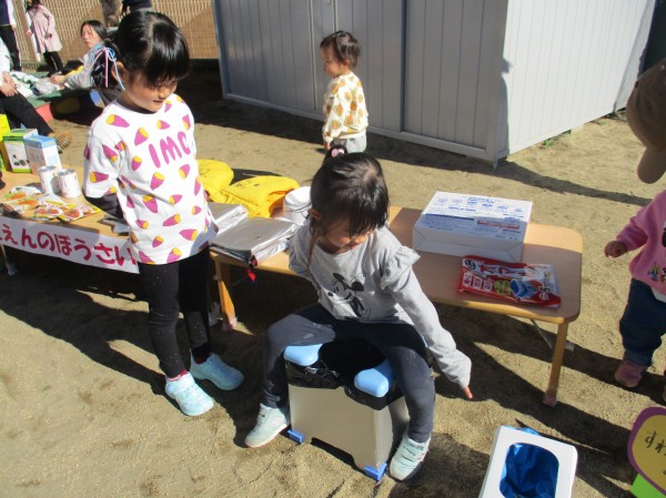 そして、今年の『やきいもふぅふぅの会』は防災体験も出来る催しとしまして、保育園に備蓄している食料やポータブルトイレ等を見たり触ったり、座ってみたりする体験を取り入れてみました。