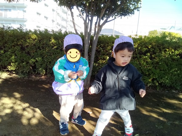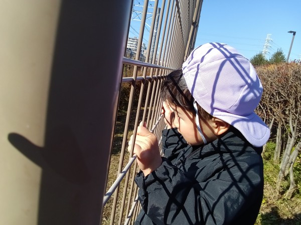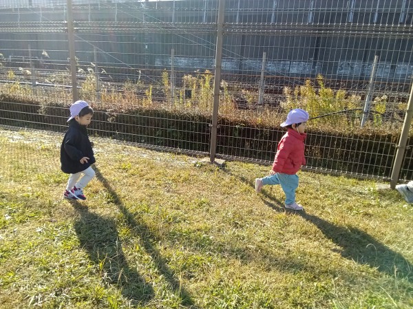 道中、保育者の真似をして「おはようございます!」とすれ違う人にあいさつをする姿は、今までも多く見られていましたが、今日は公園に遊びに来た人にいつもよりも元気よく挨拶することができて、感心するほどでした。一人が挨拶すると、他のお友だちにも伝染していき、みんな「こんにちは!」とあいさつすることができました。