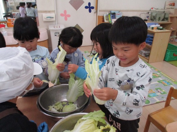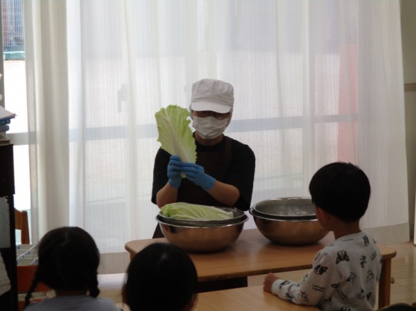 初め、子どもたちは「キャベツだー」と言って喜んでいましたが、給食さんから白菜の話を聞くと真剣な表情に…
