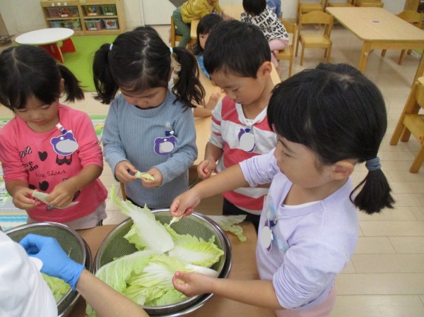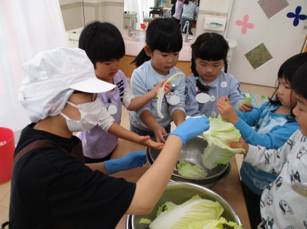 こどもの家・志木中宗岡保育園 食育、白菜をちぎったよ!!3歳児(ぺんぎん組)