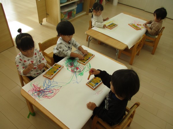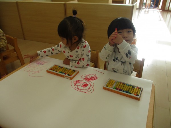 まずはクレヨンあそび!大きな模造紙に嬉しそうな子どもたちです