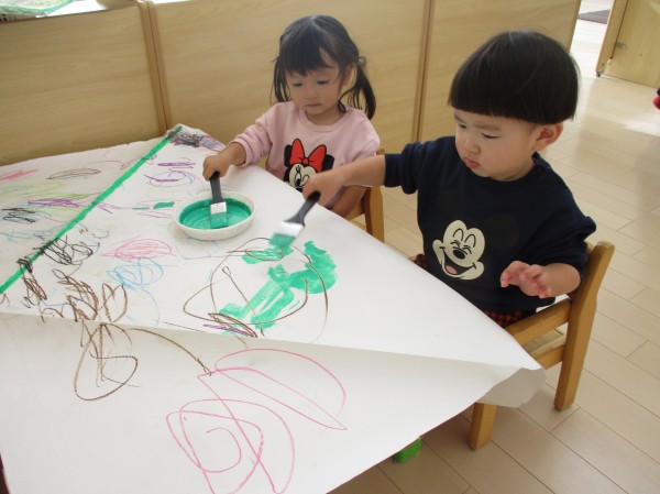 1歳児あひる組も模造紙にクレヨンと絵具を使ってお絵描きを楽しみ、ツリーを作りました(^^)/