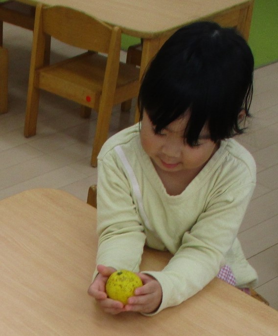 「(表面が)でこぼこしてるね」「いい匂いがする!」と言って、柚子の触り心地や香りを堪能していました。