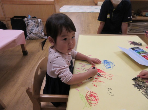 大きな紙を前に、各々好きな色のクレヨンを持ち自由にお絵描きを楽しみました(^^♪