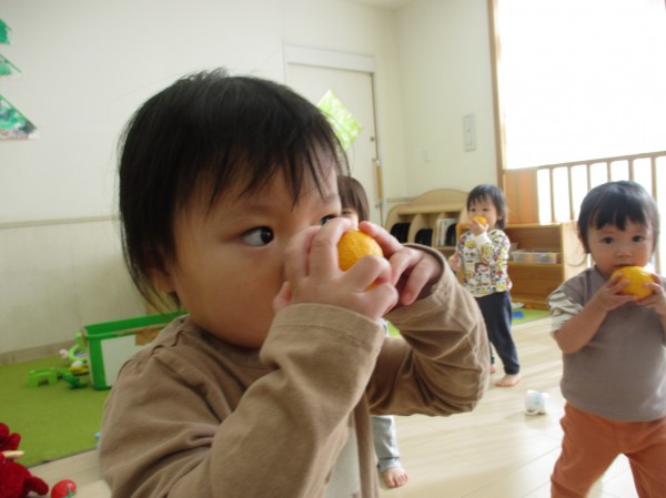 はじめは「みかんだ!」「これなあに?」と不思議そうな子どもたちでしたが、1人ひとつずつ柚子を貰うと、手触りを楽しんだり、鼻に近付けて匂いを嗅いでみたりしていました。部屋中に柚子の香りが広がりとても癒されました♡