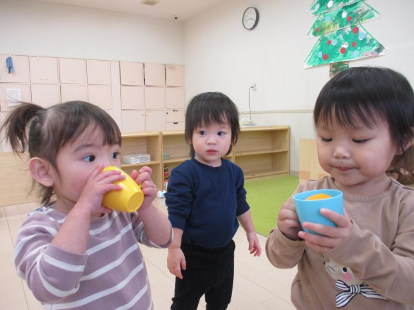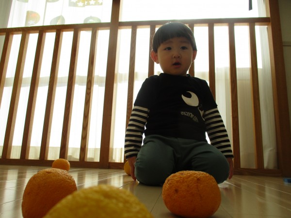 柚子が気に入ったようで、後日また柚子を出して遊びました。フライパンやコップを使っておままごとをしてみたり、沢山並べて「おおきい」「ちいさい」「葉っぱ付いてる」等と発見したことを嬉しそうにお話ししてくれたりと、色々な楽しみ方をしていました。