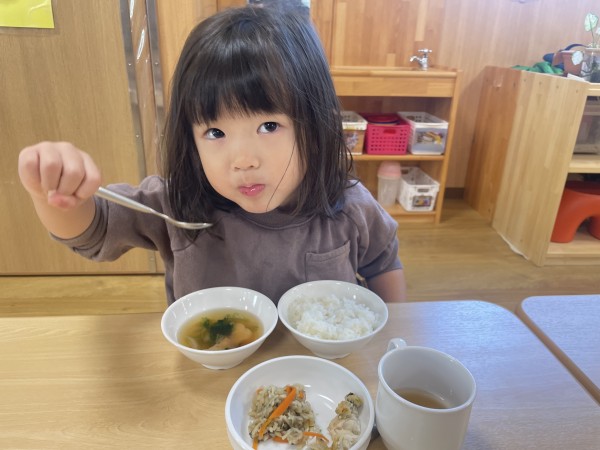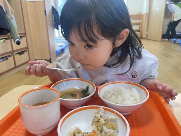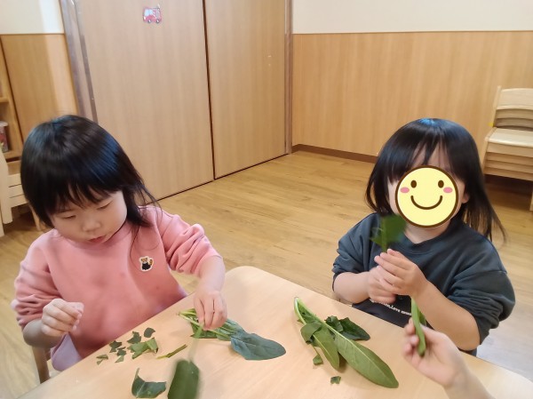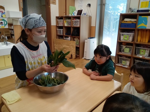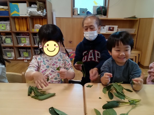 今日の給食のお汁ものは、みんなでちぎったほうれん草。おいしくいただきました!