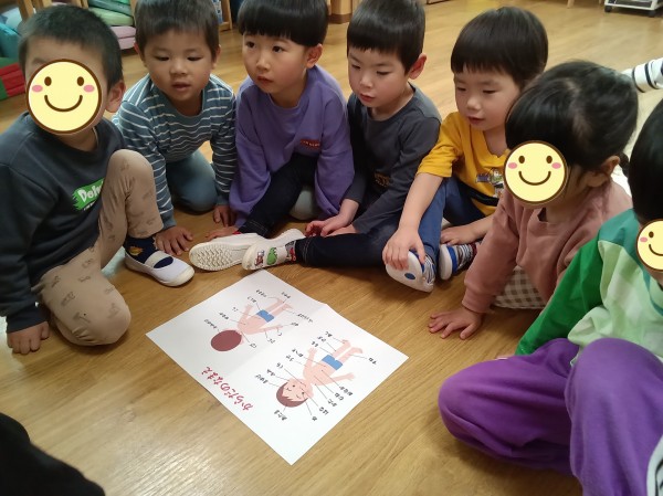 今回、3歳児クラスのぱんだ組には、体の部位の名称を覚えてもらうことと、少しだけですが体の働きについて知ってもらおうと健康教育を実施しました。