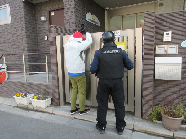 不審者対応訓練とは、実際に不審者が現れた場合の対応方法や園内に不審者が侵入した場合の避難方法を確認するために行うものです。保育園では、災害時の避難訓練と同様、園児に危険が及ばないよう、定期的に不審者への対応の訓練が大切になります。今回は、ALSOK(総合警備保障)への通報により警備員が救助に来るという想定で訓練を行いました。
