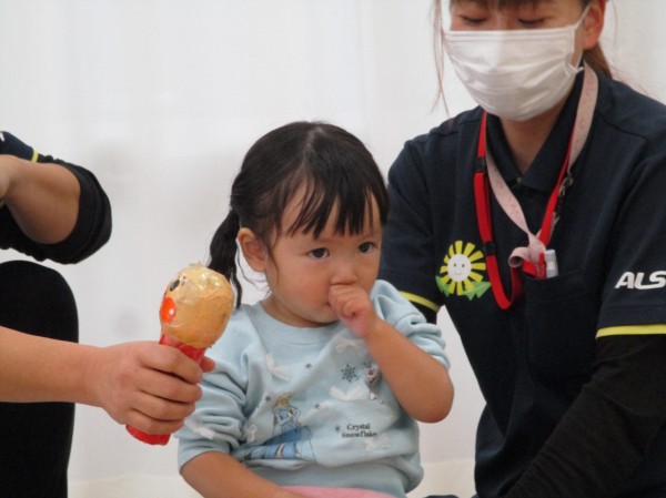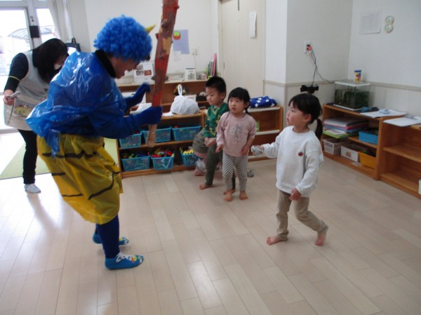 その後、乳児クラスは各クラスに鬼さんが遊びに来てくれました。