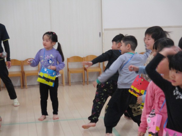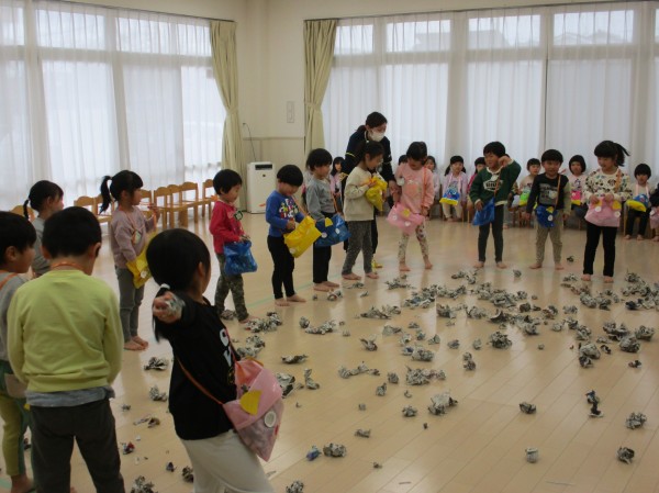 幼児クラスは引き続きホールで節分集会を行い、優しい鬼さん達と豆まきを楽しみました。
