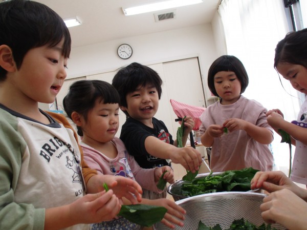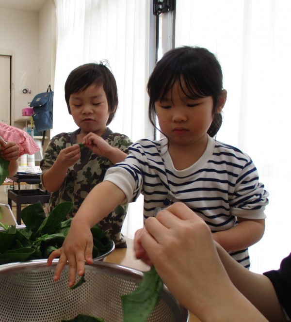 先日、おすましにはいるほうれん草を小さくちぎる食育をしました。