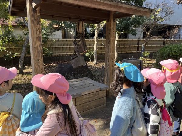 昔ながらの井戸があり、「今は水道からお水が出るけど、昔は深い井戸で少しずつお水を汲んでいたんだよ」と説明すると不思議そうな表情で聞いていました。