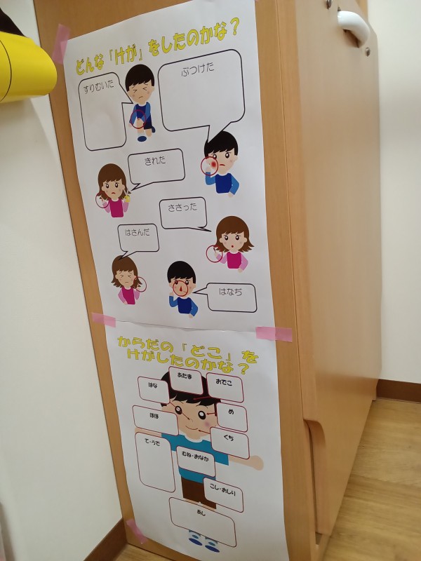 けがをして保健コーナーに来た時に、「からだのどこに」「どんなけがをしたのか」を説明できるように、掲示物を貼りました。最初にここに貼りにくるのはぱんだ組さん?それとも別のクラスのお友だちかな?