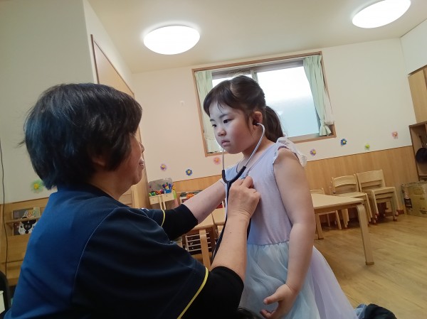 体長数センチの頃に心臓が動き始めてから今まで、みんなの心臓はずっと動いていることを伝え、自分の心臓の位置を確認しました。位置と大きさを確認した後、心臓の音を聴診器で聞いてみることにしました。