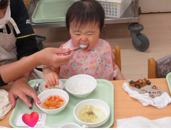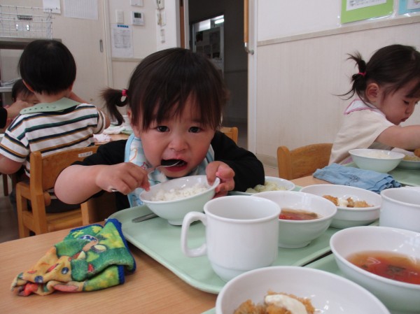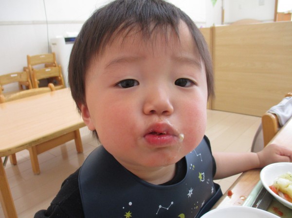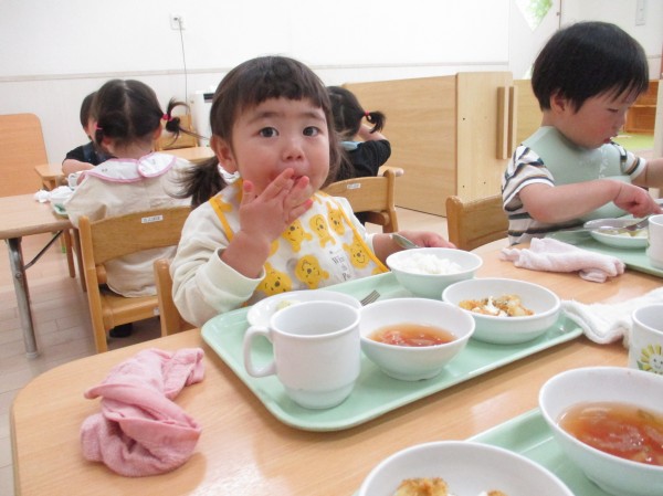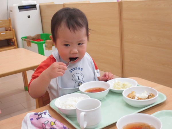 まずは、1歳児クラスの子ども達。大きなお口でパクパク食べていますね( *´艸`)