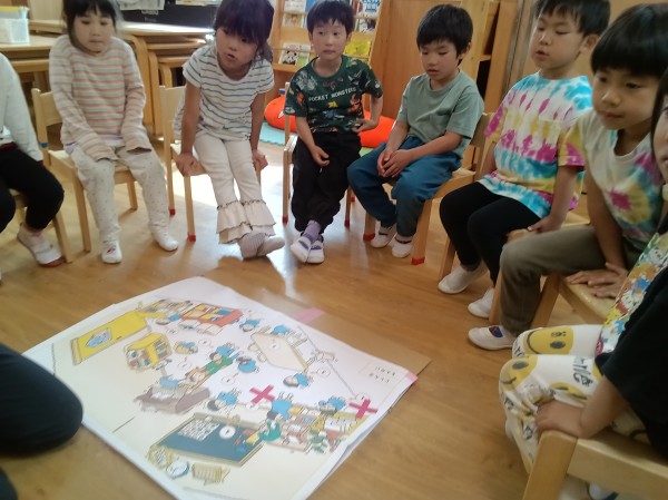 4月は、全職員に「船橋市で起こりうる災害とその備え」の研修を実施いたしました。近年発生が予測されている地震や、温暖化の影響での集中豪雨などの災害の危険性と、どのように備えるべきかを周知しました。今回、こどもたちについても、「自分の命は、自分で守る」ために、防災教育を行いました。日本赤十字社の防災教材「ぼうさいまちがいさがし」を使って、室内の危険な場所や、地震から身を守る行動についてお話をしました。
