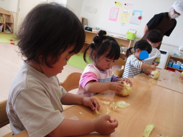 こどもの家・志木中宗岡 食育 新玉ねぎの皮むき(らっこ組)
