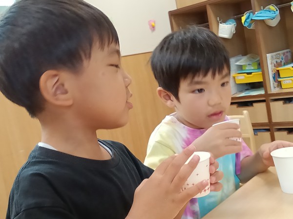 一昨日みんなでスーパーに買いに行ったオレンジを絞って、市販のオレンジジュースと飲み比べをしました。