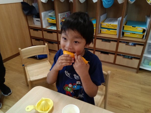 食育「オレンジ絞り、ジュース飲み比べ」