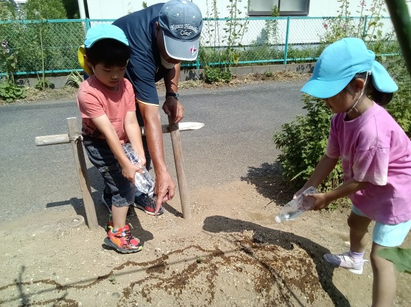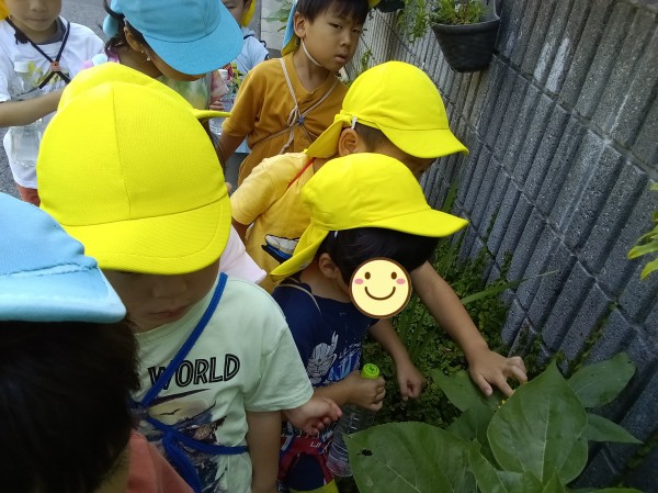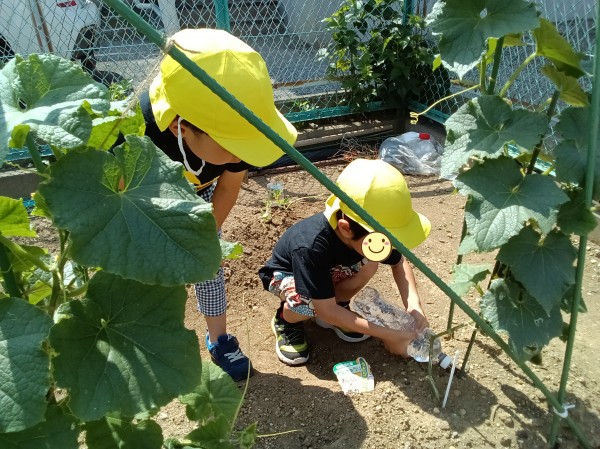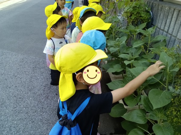 保育園の前にある、きりん・ぞう組が種を植えたひまわりの花が咲き始めました。畑では、じゃがいもの芽が出始めていたり、スイカの花が咲いていたりと、様々な変化が見られました。