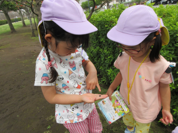 お散歩先の公園では草花や昆虫等の季節の自然物を見つけ、みんなで興味深く観察しています。幼児組は月刊誌の付録の個人の図鑑を持って行き、新しい発見や疑問をその場で調べて「これは〇〇っていうんだよ」等と嬉しそうにお友達や保育者にお話しする姿が見られます。また、保育園に戻ると「今日はだんごむし見つけた!」「ちょうちょもいたよ!」と嬉しそうに報告してくれます♪