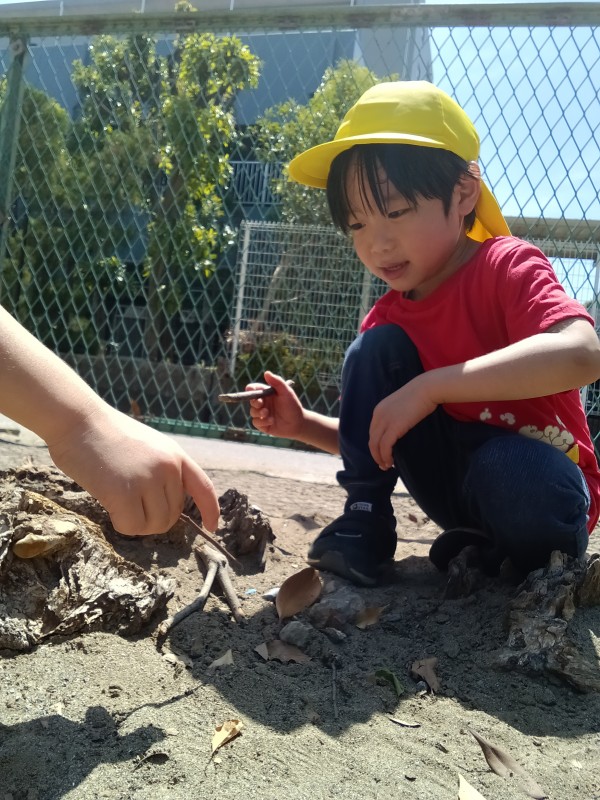 砂遊び玩具だけではなく、身近なもの(小石や木の枝など)を工夫して遊びに取り入れ、見立て遊びやごっこ遊びなどを楽しむ子ども達。