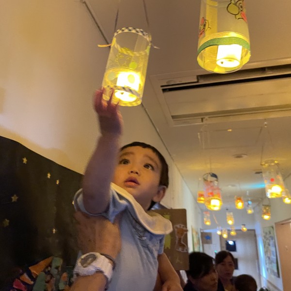 自分の作ったランタンを見つけて嬉しそうに教えてくれたり、お友だちのランタンを見て「きれいだね」と会話したりしていました。