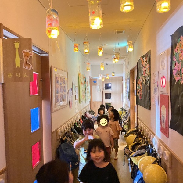 おやつ後に2階の廊下を暗くして、夏フェスで作ったランタンに灯りをつけました。