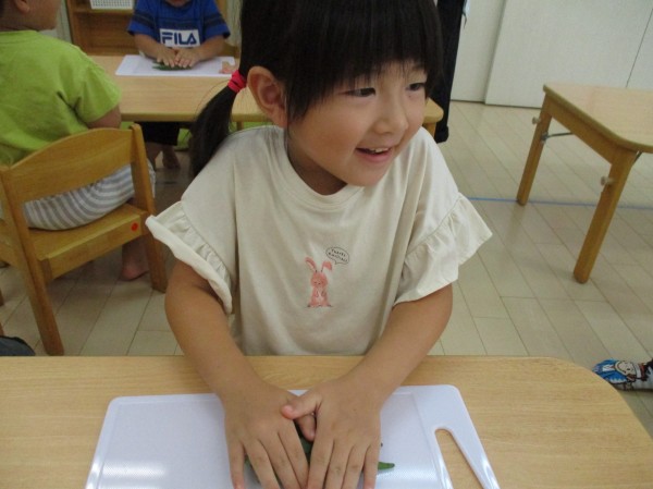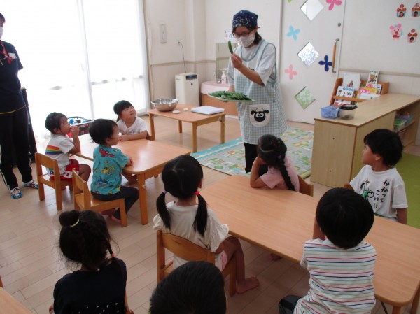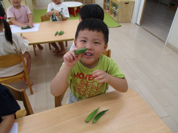 こどもの家・志木中宗岡 ぺんぎん組(3歳児) オクラの板ずりに挑戦!