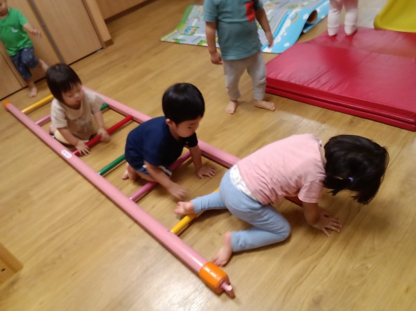 二段になっている巧技台を両足ジャンプで降りることができるようになってきました。滑り台を滑ったり、はしごを様々な体勢で渡ったりして、たくさん体を動かして遊びました。