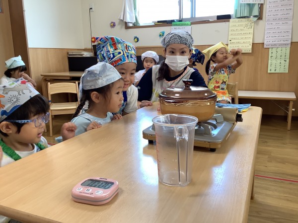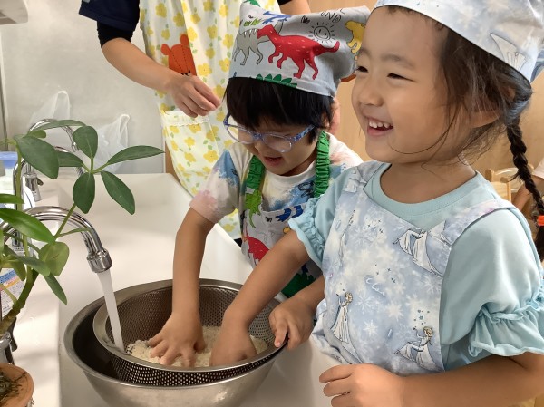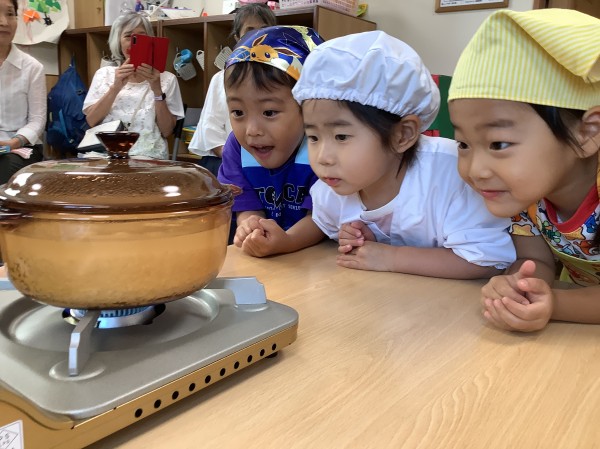お米を丁寧に研いで、透明な鍋で炊きました。ぐつぐつ炊けていくのを見ていましたが、沸騰してお湯がこぼれると「火事になっちゃうよ!」と慌てる子もいました。