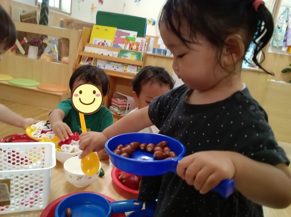 幼児組から借りてきたドングリを使って水遊びをしました。