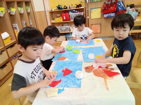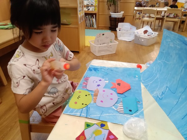 海や森の生き物たちを個人台紙に貼り付ける制作をしました。