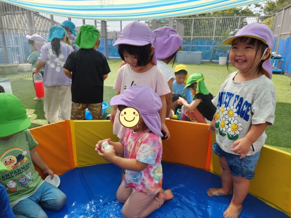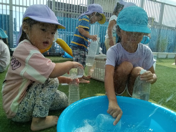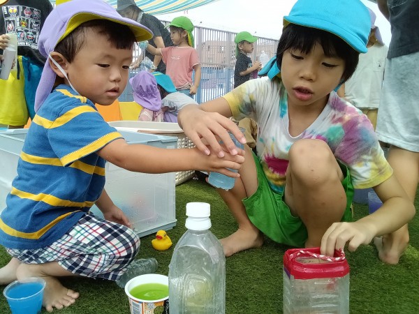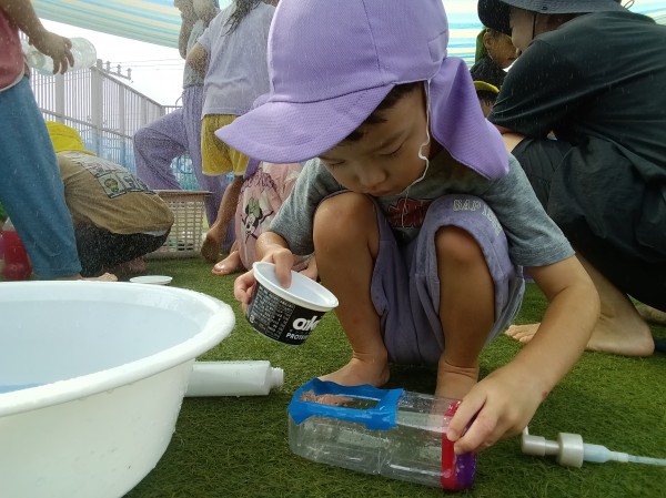 屋上に行ってみると、幼児組のお友だちがたくさん!色水遊びやプール遊びをしていたので、一緒に遊びました。お兄さんたちが作った色水を興味津々に見ていて、自分だちでも色を混ぜて作って楽しんでいました。
