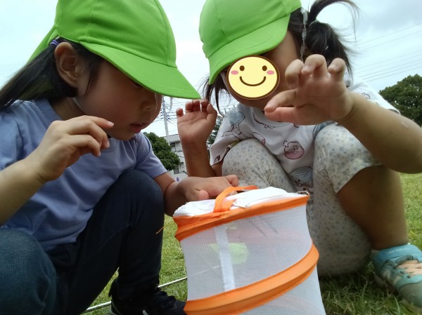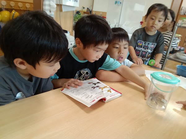 公園に行く前は「縄跳び頑張るんだ~」と張りきっていたのですが、公園に着いた子どもたちの目に飛び込んできたトンボの大群。「あ~網持ってくればよかった…」と残念そうにしていた子どもたちに「実は…ちゃんと持ってきました~!」と網を見せると「うぉ~!先生、さすが!!」と大興奮。早速、網を手に取り、トンボを捕獲すべく、公園中を右へ左へ走り回っていました。しかし、緩急をつけて飛び回るトンボに翻弄される子どもたち…そこで、みんなで作戦会議。「静かにした方がいいんじゃない?」「追いかけるんじゃなくて、来るのを待つのはどう?」と意見を出し合いました。作戦会議のかいもあり、2匹のトンボを捕まえることに成功しました。捕まえたトンボを見ていると「あれ?色が違う?」「2匹は違う種類のトンボなのかも…」と気づいたので、保育園に連れて帰り、図鑑と見比べながらトンボの種類も調査しました。