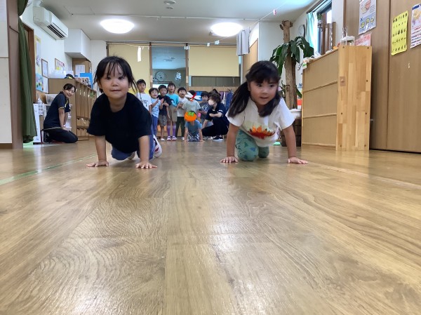 体操は、ドラえもんのラジオ体操、ディズニー体操の他に、初めて「チェッチェッコリ」に挑戦しまいた。どんどん早くなる音楽に笑いが止まらなくなってしまった子どもたちでした。