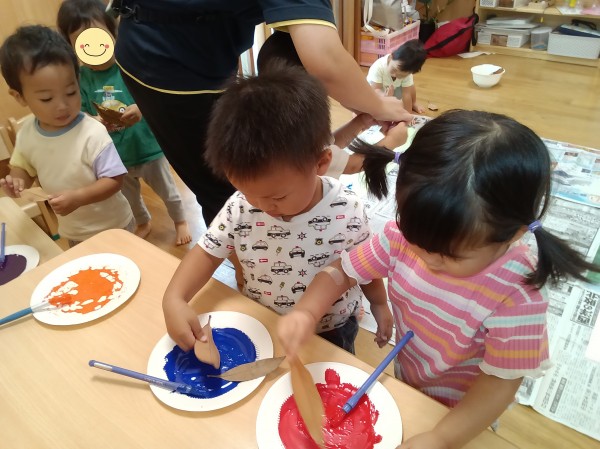 ドングリや葉っぱを貼り付けるチームと葉っぱに絵の具を着けて模造紙に色付けしていくチームの2つに分かれて、秋の自然物に触れていきました。葉っぱに絵の具が付くと不思議そうに見つめていた子どもたち。自由に模造紙に色をつけていき、好きな色を言いながら楽しんで遊んでいました。