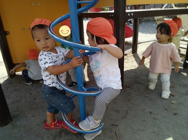 お友だちと向かい合って座ったり、遊具の階段の隙間からお友だちを見つけて「ばあ」と笑いあったりと、微笑ましい姿がたくさん見られました。