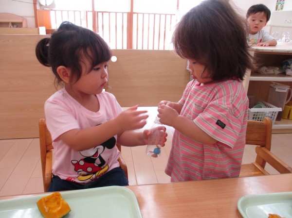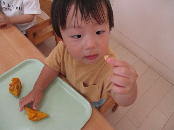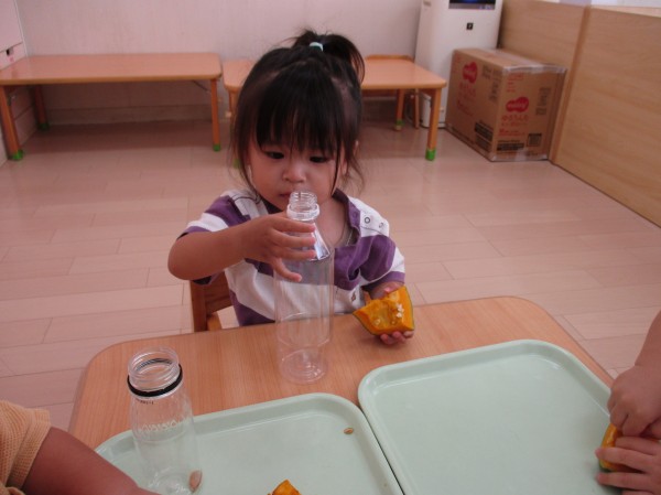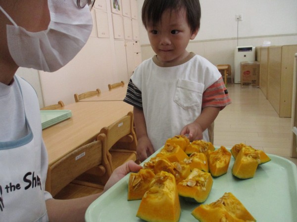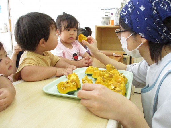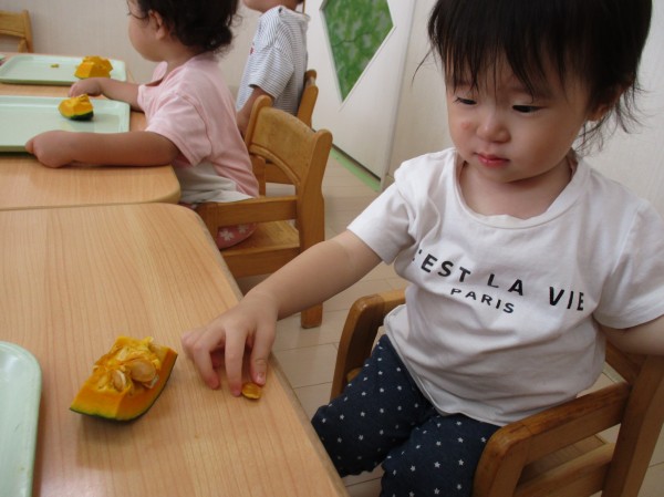 こどもの家・志木中宗岡 食育☆かぼちゃの種取り あひる組(1歳児)