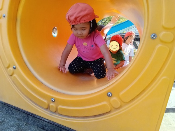 今日は、お友だちや保育者と手を繋いで公園へ行きました。公園まで初めてバギーを使わずに向かうことができました。公園では、フェンス越しに大きな電車を見たり、保育者と一緒に追いかけっこを楽しむりす組さん。また大型遊具の滑り台に腰掛けたり、トンネルのなかをくぐったり、ままごとコーナで小石や小枝を手渡してお店屋さんごっこを楽しむ姿がありました。帰りも、疲れた様子はありましたが保育者に励まされながら園まで歩いて帰ることができました。
