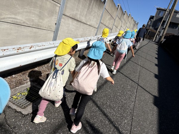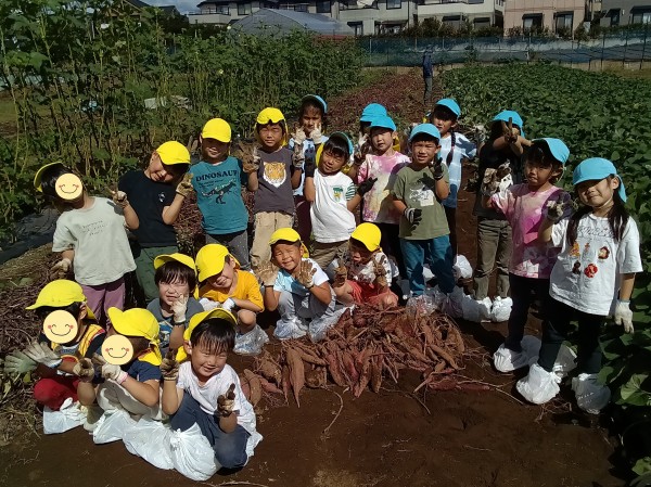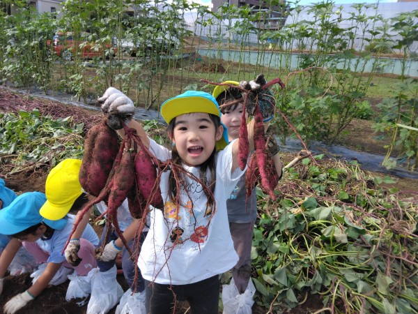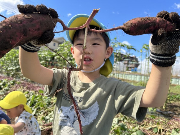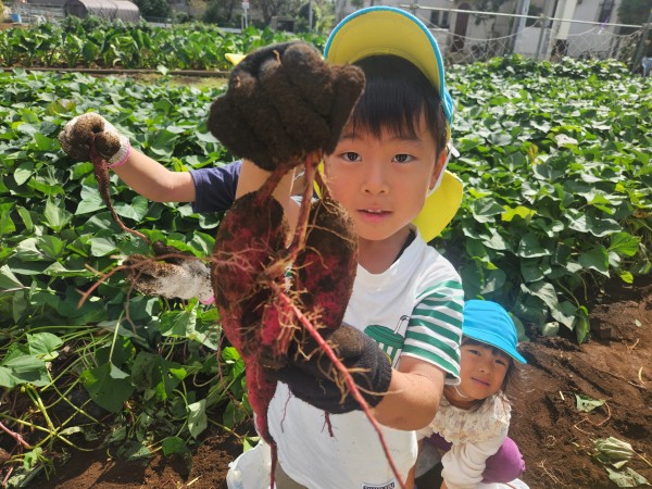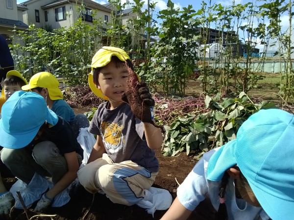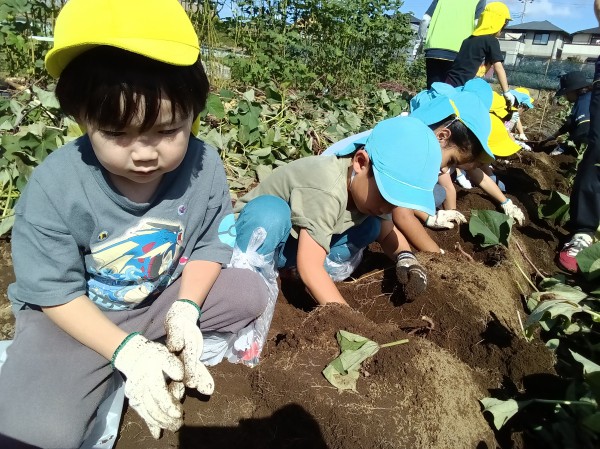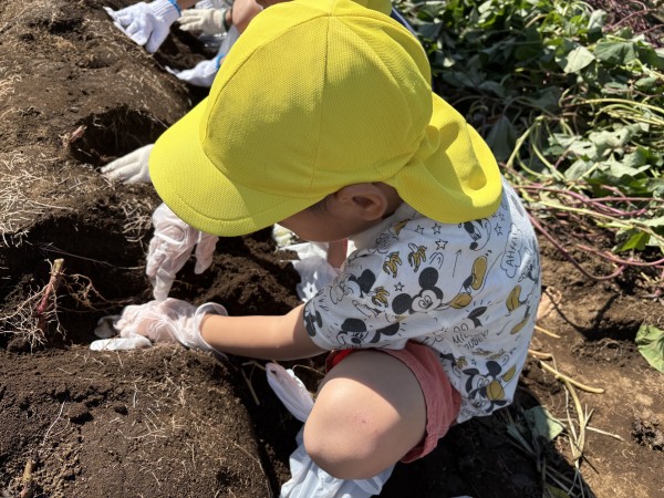 今日は、楽しみにしていたお芋ほりでした。お部屋で、自助バッグに水筒、ビニール袋、軍手などを入れて、早々と準備が完了していた子どもたち。予定の時間前に無事保育園を出発することができました。畑では、1人2株のサツマイモを担当することになり、自分の目の前のさつまいもを丁寧に掘りました。「あ、ダンゴムシ!」「こっちに、へんな虫がいたよ~」「こっちは、ふたごのおイモだ~」「なんだか大きすぎてぜんぜん出てこないよ~」などとあちこちから子どもたちの楽しそうな声が聞こえてきました。お友だちのおイモを一緒に掘ってあげたり、軍手をはずすお手伝いをしたりと、協力しあう姿もたくさん見られたきりん組とぞう組です。往復100分の道のり(1万256歩)を頑張って歩きました!