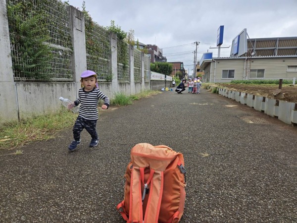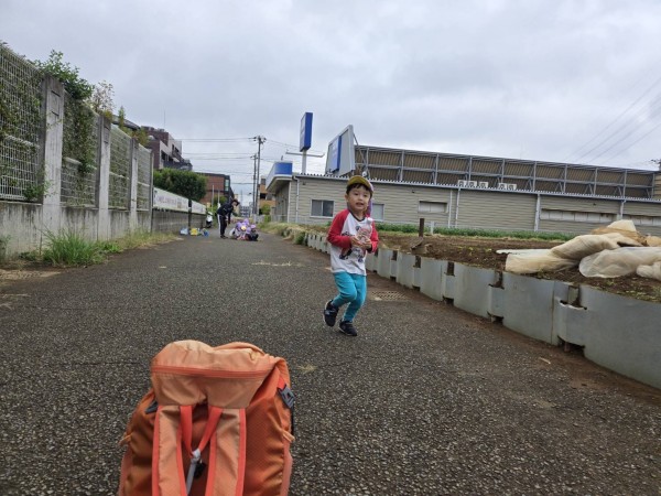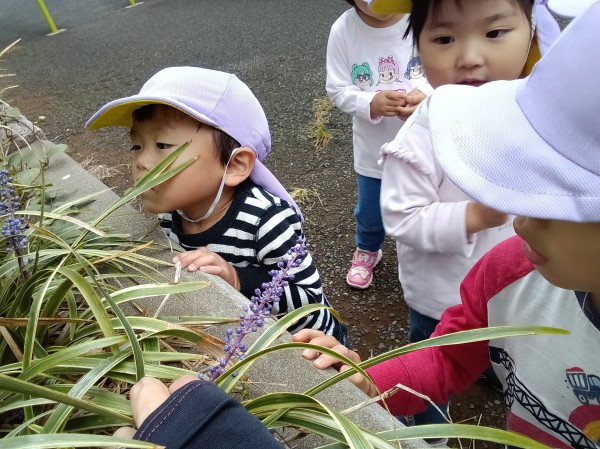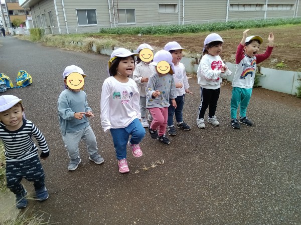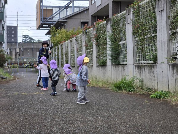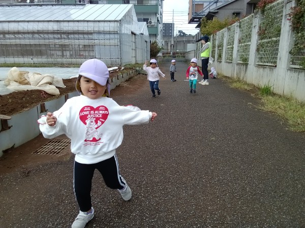 の緑道までお散歩に行きました。着くなり「リレーしようよ!」と元気いっぱいの子どもたち。保育者と鬼ごっこをしたり、お友だちと競争をして楽しみました。散歩中、「今日はピンクと黄色と紫のお花見つけたね」「白いのもあったよ!」と道に咲く花たちの色を観察しながらも、「今日の給食なんだっけ?」とお腹が空いてしまった様子のうさぎ組さんでした。