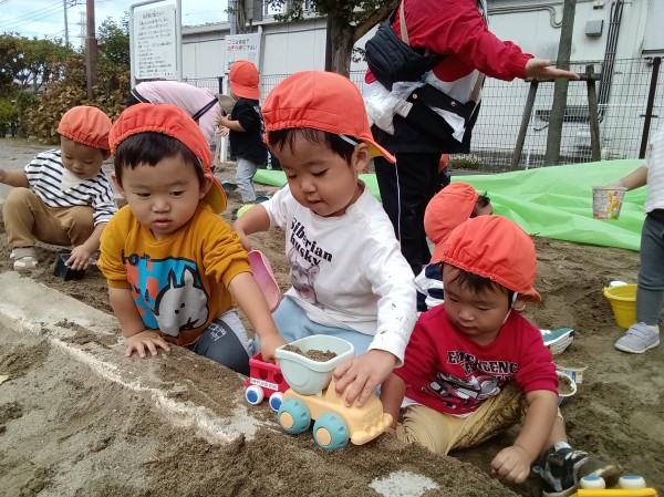 今日は、公園で遊びました。公園へ向かう途中、消防車が通ると嬉しそうに手を振る子どもたちでした。公園では砂遊びをしました。大好きな車や船のおもちゃに砂を入れて手で走らせたり、落ちていた木の実やどんぐりを使ってケーキを作るなどそれぞれ好きな遊びを楽しんでいました。今までは保育者と一対一で遊んだり、一人で夢中になって遊んでいましたが、少しずつお友だちの隣で同じ遊びをしたり、木の実をどうぞと手渡したりと、お友だちとの関わりが広がってきたようです。