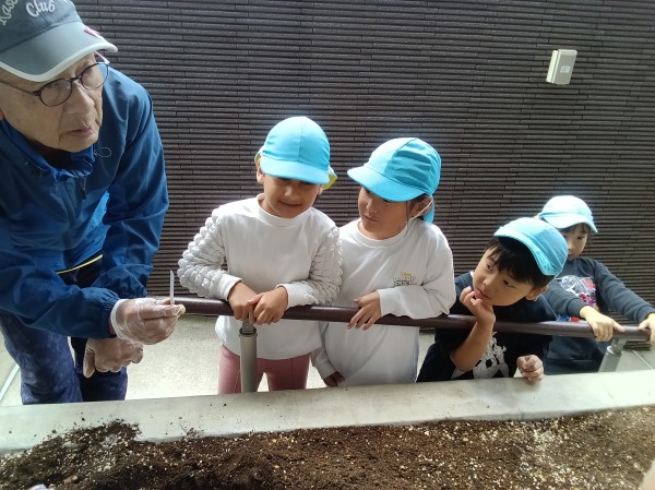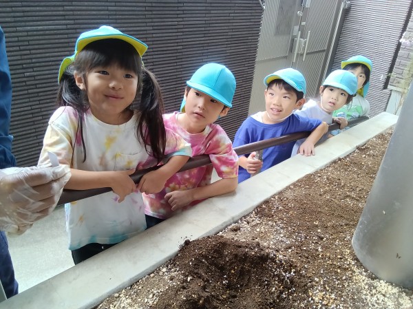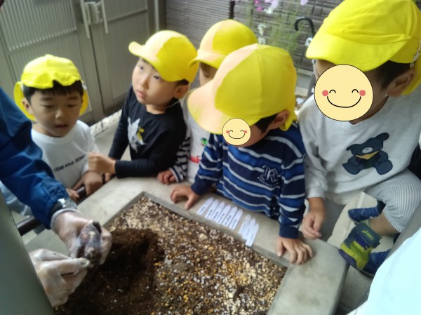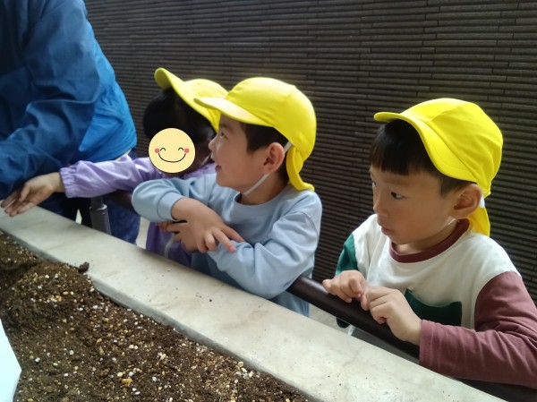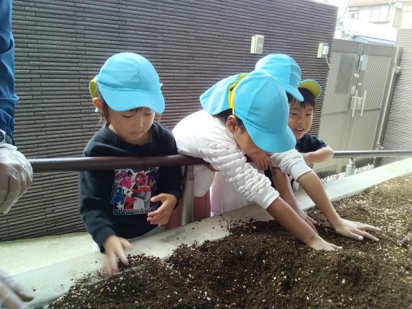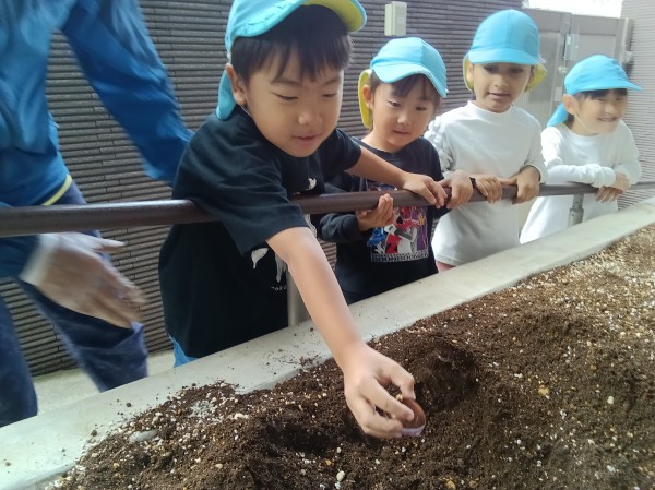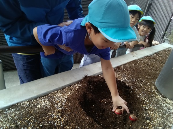 今日は、玄関にある花壇にチューリップの球根を植えました。チューリップにも種類があり、【ゴリラ】【チェリーブライト】等の名前があること知った子どもたち、「面白いね~」と興味深そうにしていました。球根の向きや、球根同士の距離等、先生の説明を聞き、実際に球根植えに挑戦。「ここが上だね」としっかり確認しながら上手に植えることができました。「何色の花が咲くんだろう」「いつ頃咲くかな~」「頑張って大きくなるんだよ~」と声を掛ける姿も見られました。