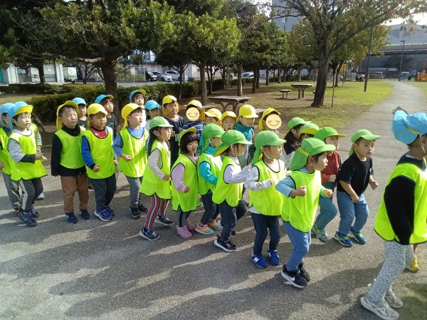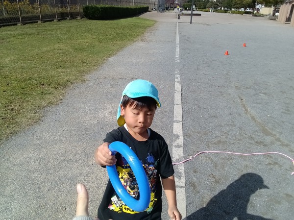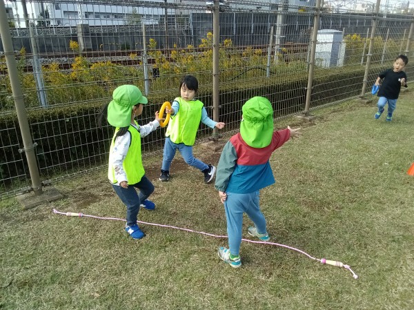 今日は、3クラス合同で公園へ行きました。今日は運動会のリレーの練習を入場するところからやることが一番の目的でした。昨日決めたチーム名「スポーツカー」と「のぞみ」に分かれて走りました。まっすぐに並ぶことが難しかったのですが、何度か練習するうちに少しずつ上手に並べるようになってきました。「もう少しこっちにずれたほうがいいよ」「まだちょっと曲がってるよ」などと、気付いたお友だちが教えてあげる姿も見られました。リレーは、逆走やコースのショートカットなどハプニングもありましたが、一生懸命に走り、お友だちの応援もしっかりしていました。リレーの後は、遊具で遊んだり、落ち葉を拾ったり、縄跳びをしたり、好きな遊びを楽しみました。