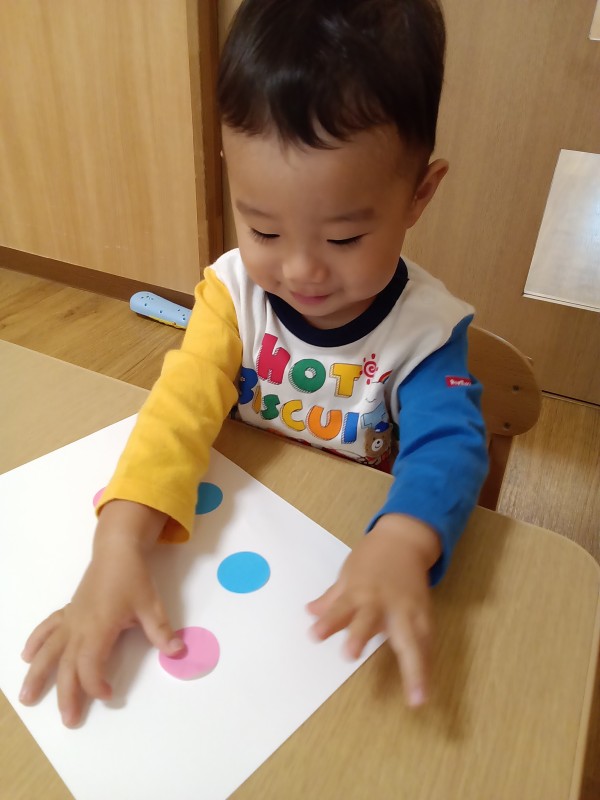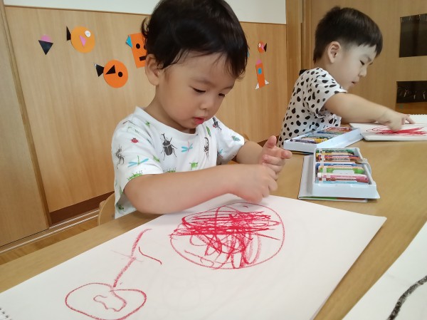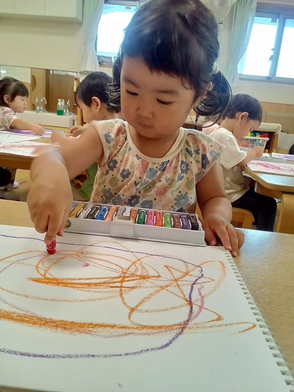 クレヨンを持って描いたり、シール貼りをしたり、粘土遊びなども楽しんでいます(^^♪