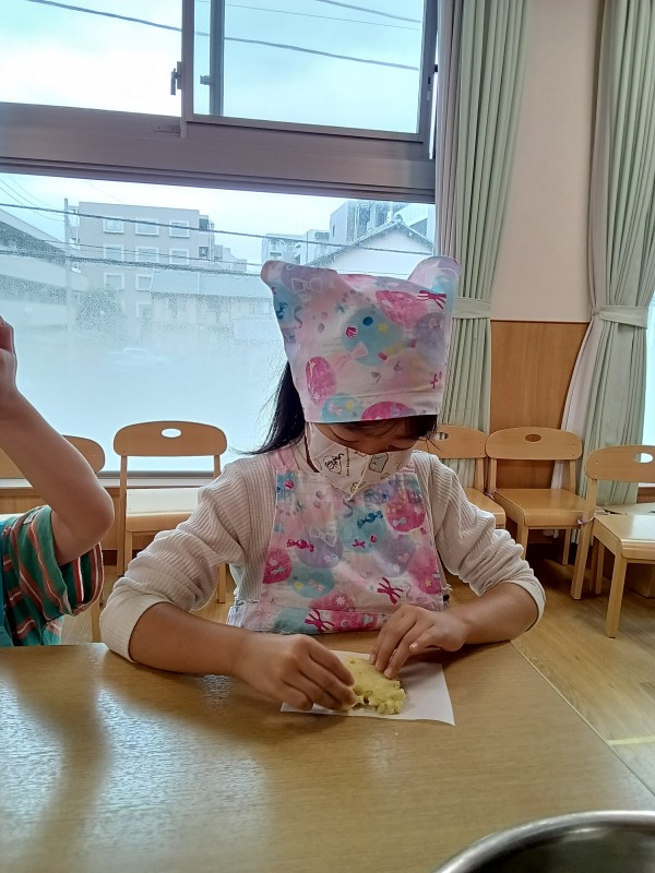5歳児ぞう組は、蒸かしたさつまいもを潰す生地作りから行いました。